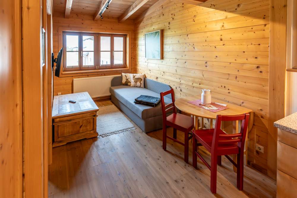 Dieses Apartment bietet alles, was man für eine erholsame Auszeit braucht: eine praktische Küchenzeile, ein einladender Essplatz mit Blick ins Grüne und ein Wohnbereich, der trotz seiner Größe zum Verweilen einlädt. Die warme Holzgestaltung sorgt für ein behagliches Wohngefühl, während clevere Raumlösungen den vorhandenen Platz optimal nutzen. Ein perfekter Rückzugsort für alle, die es unkompliziert und charmant mögen.